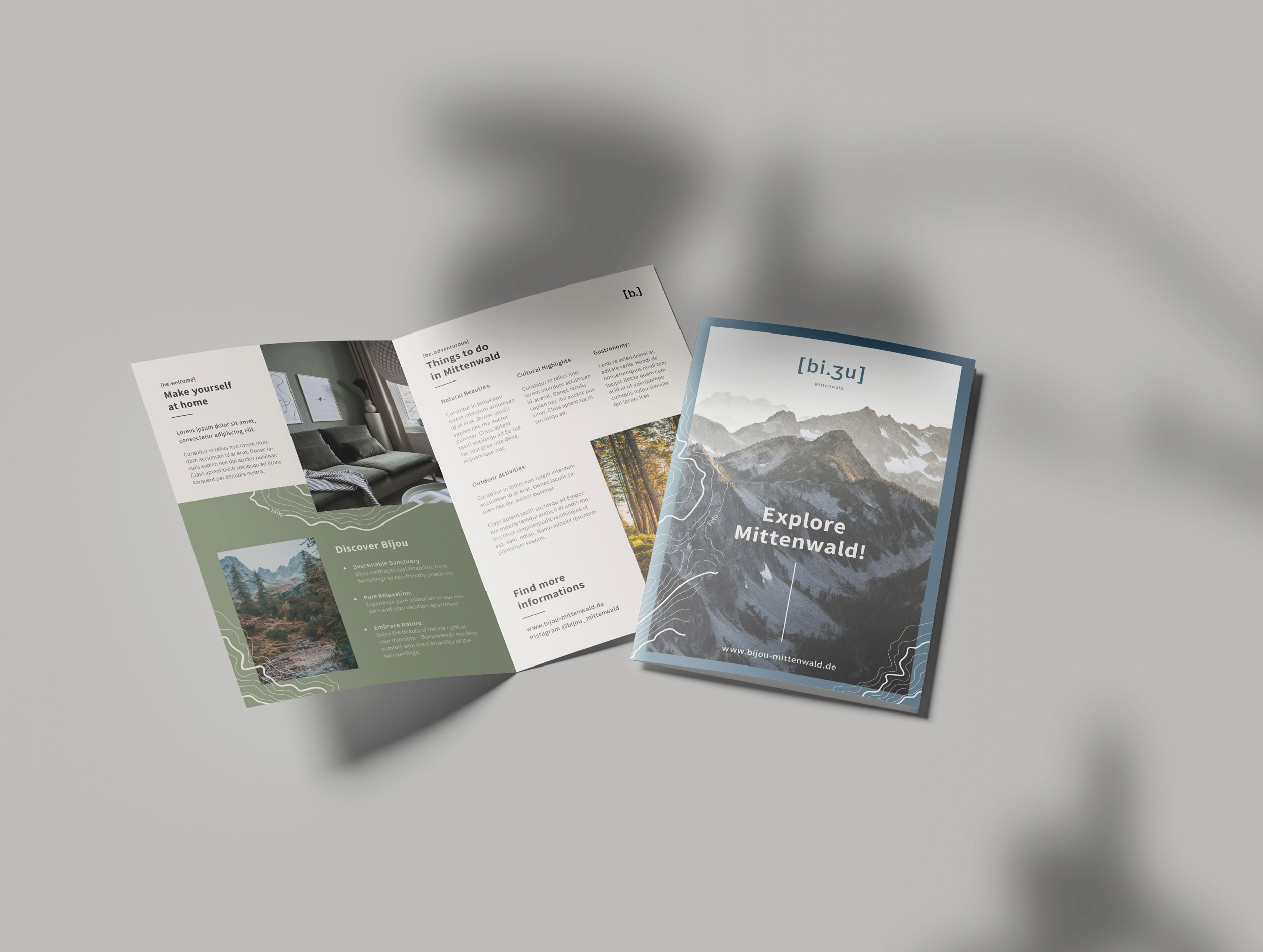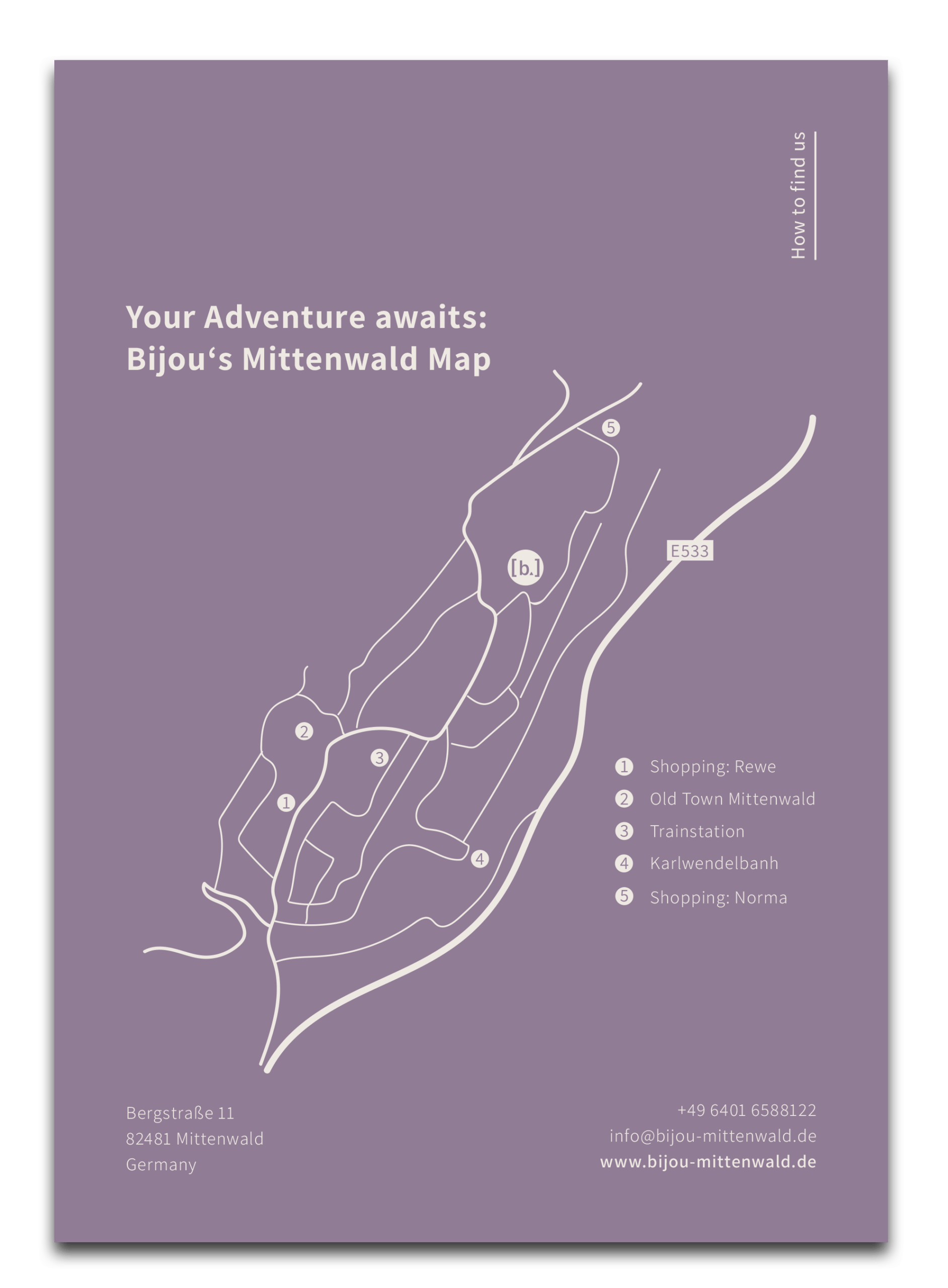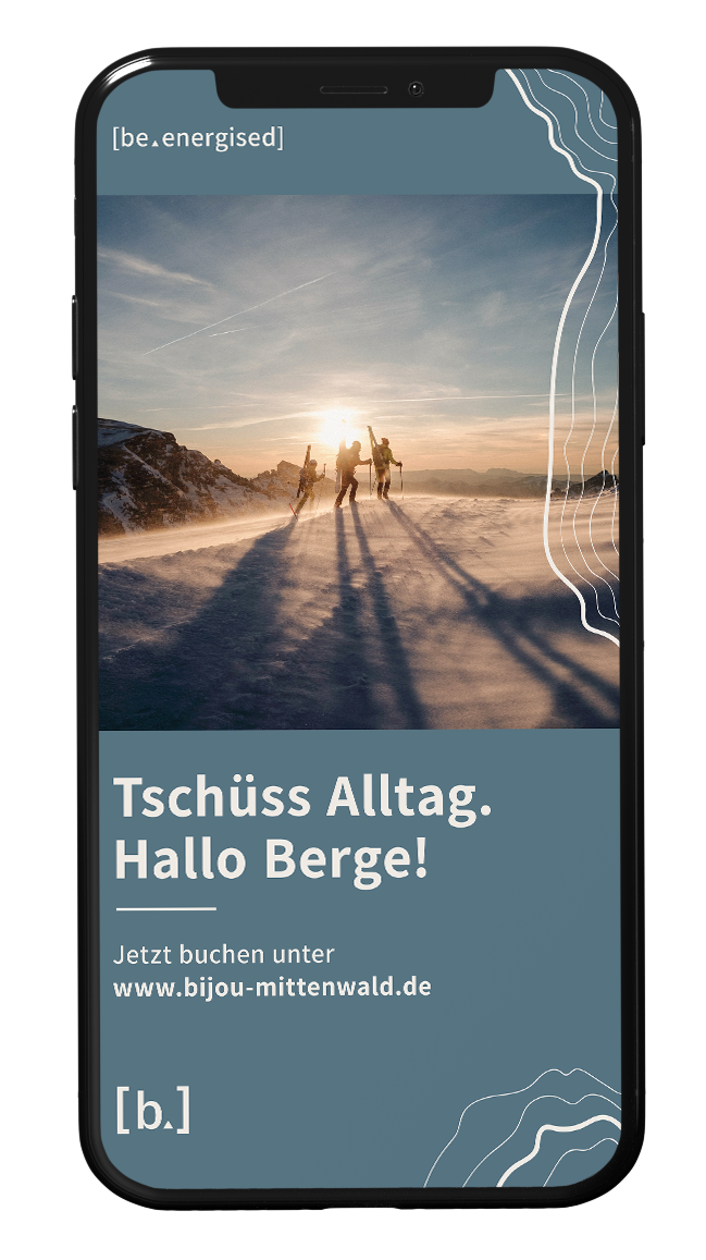 Bijou is a holiday retreat in Mittenwald, Bavaria, that offers guests a unique place to connect with nature and escape everyday life. The French name "Bijou" translates to "jewel," symbolizing the accommodation as something precious and distinctive. For this client project, I developed a new corporate design, including a logo in phonetic transcription whose brackets frame the word like a jewel. The dot of the phonetic script was replaced with a mountain peak and additional design elements were derived from contour lines of hiking maps. I designed a consistent Instagram presence and a visual identity that combines natural colors, clarity and authenticity.