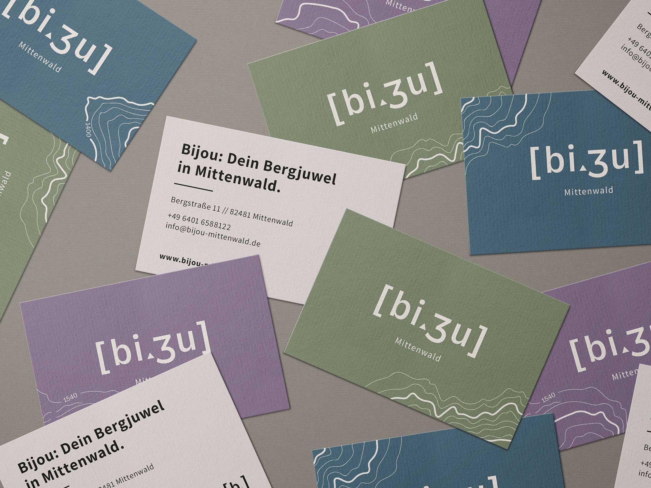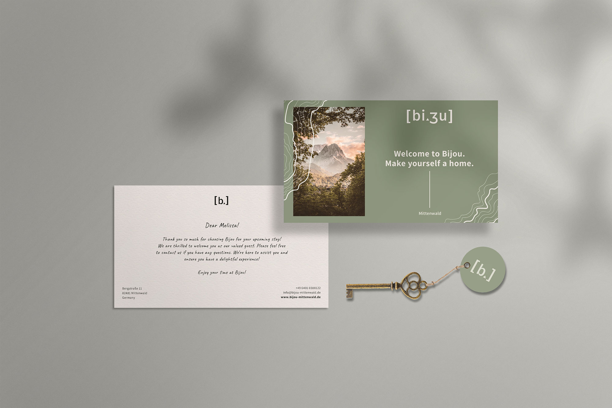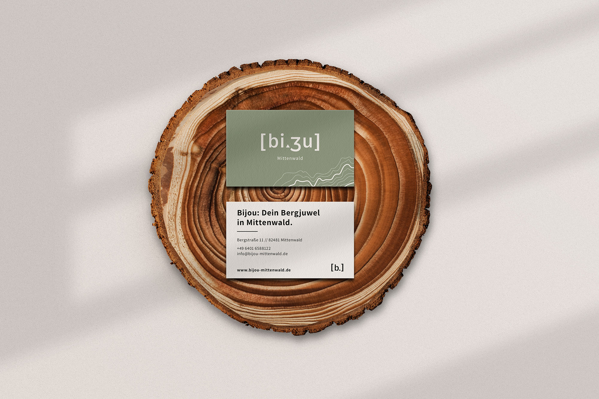 Bijou is a holiday retreat in Mittenwald, Bavaria, that offers guests a unique place to connect with nature and escape everyday life. The French name "Bijou" translates to "jewel," symbolizing the accommodation as something precious and distinctive. For this client project, I developed a new corporate design, including a logo in phonetic transcription whose brackets frame the word like a jewel. The dot of the phonetic script was replaced with a mountain peak and additional design elements were derived from contour lines of hiking maps. I designed a consistent Instagram presence and a visual identity that combines natural colors, clarity and authenticity.