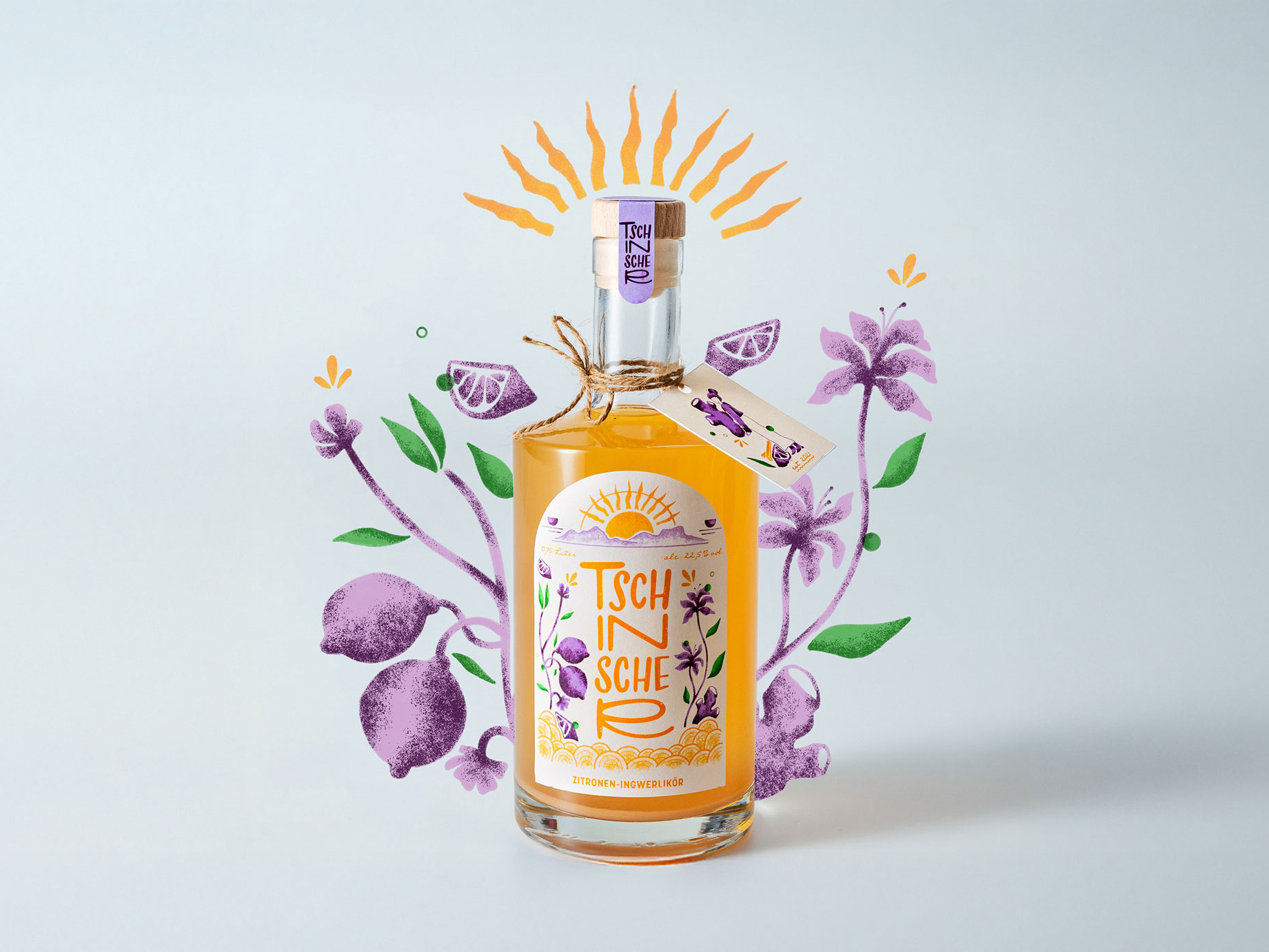 Tschinscher was founded by seven friends and produces handmade lemon-ginger liqueur in Olten, Switzerland. The swiss german name "Tschinscher" derives from the English word "ginger." With a lot of passion and dedication, Tschinscher aims to provide its customers with a special enjoyment experience and establish itself as a brand in the industry. As part of my diploma project, I aim to contribute to a compelling brand image. I developed a new corporate design, packaging design for the liqueur, and a website with a corresponding social media presence. I also illustrated and developed small characters for the label, which are integrated throughout the entire visual identity.